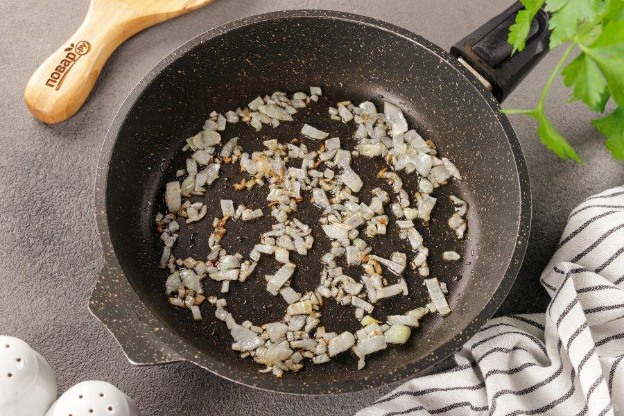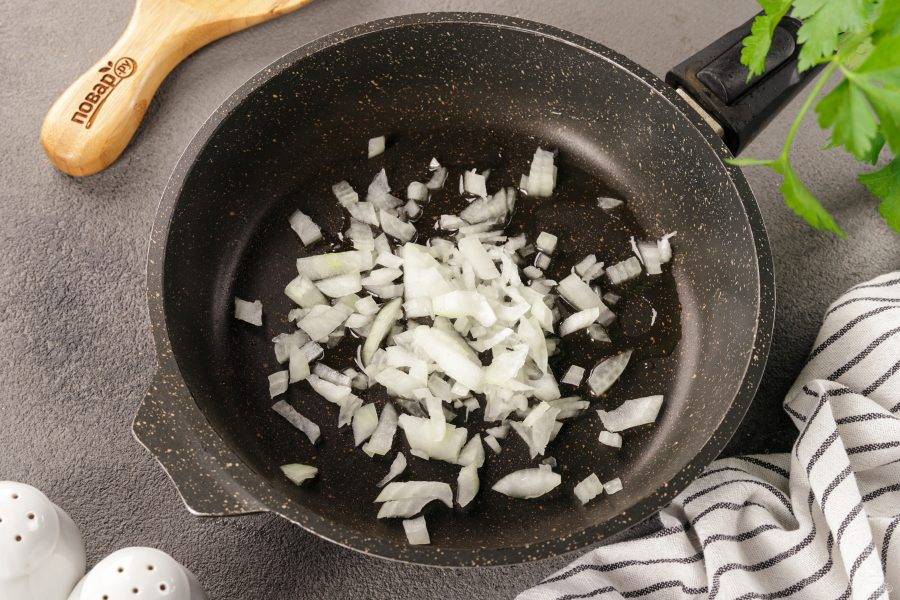 На сковороде разогрейте растительное масло. Выложите нарезанный кубиками лук.