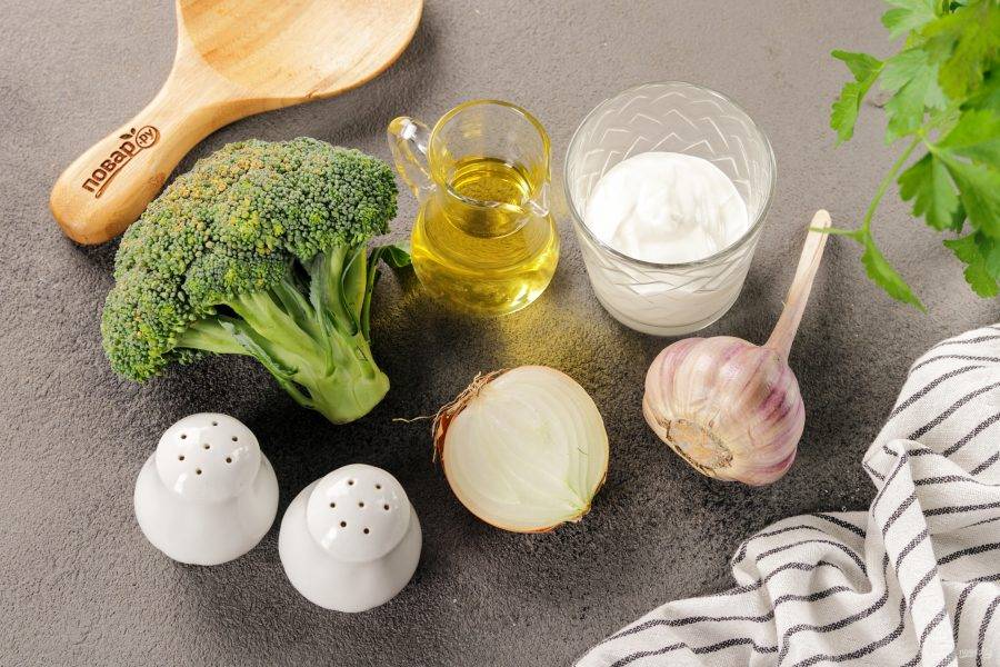 Подготовьте все ингредиенты по списку. Брокколи подойдет как свежая, так и замороженная. Замороженную предварительно размораживать не нужно. Сметану возьмите любой жирности. Из специй можно добавить мускатный орех.