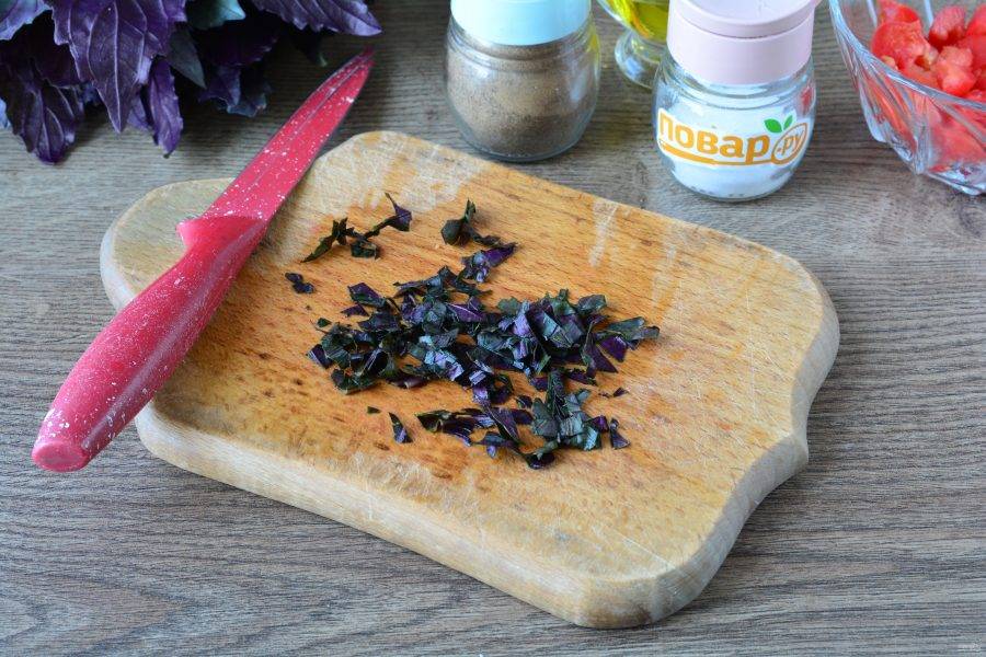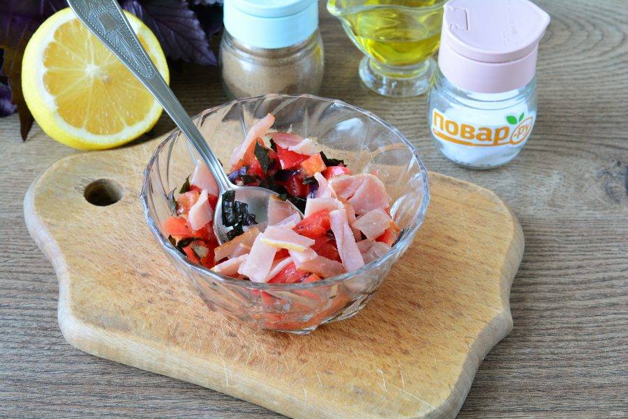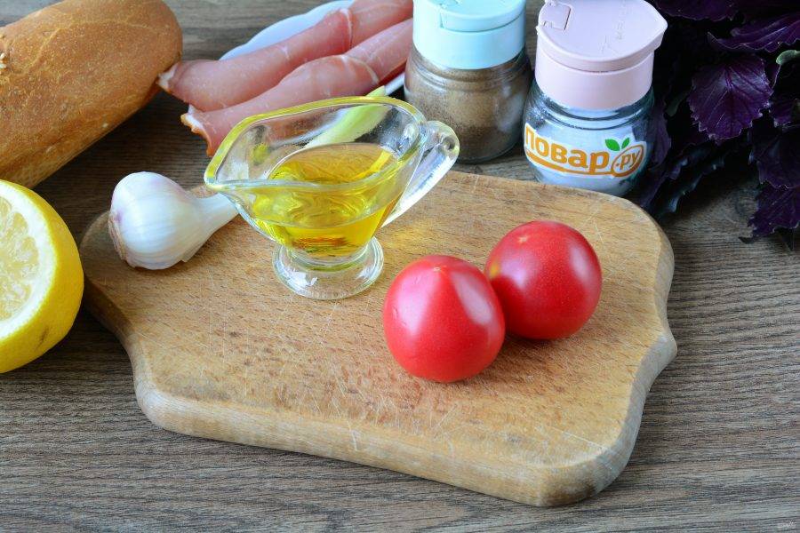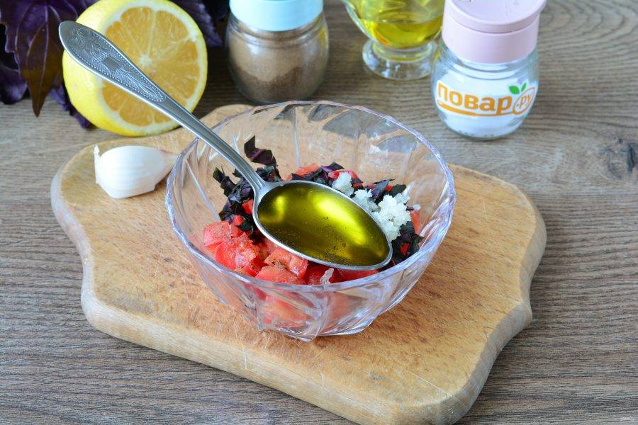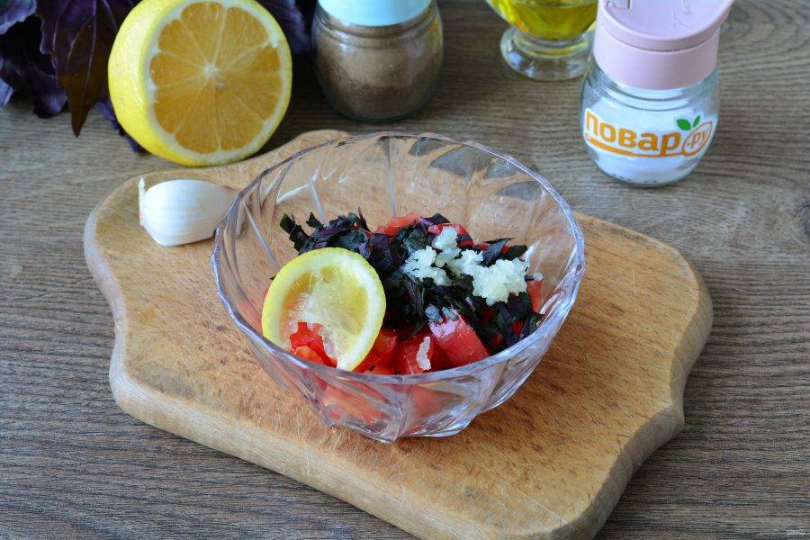 Перемешайте помидоры с базиликом, выдавите через пресс чеснок, выдавите лимонный сок. Посолите и поперчите по вкусу.