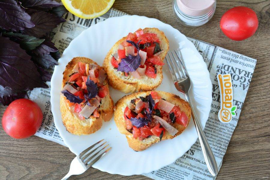 На хрустящий тост выложите начинку из базилика, помидоров и хамона.