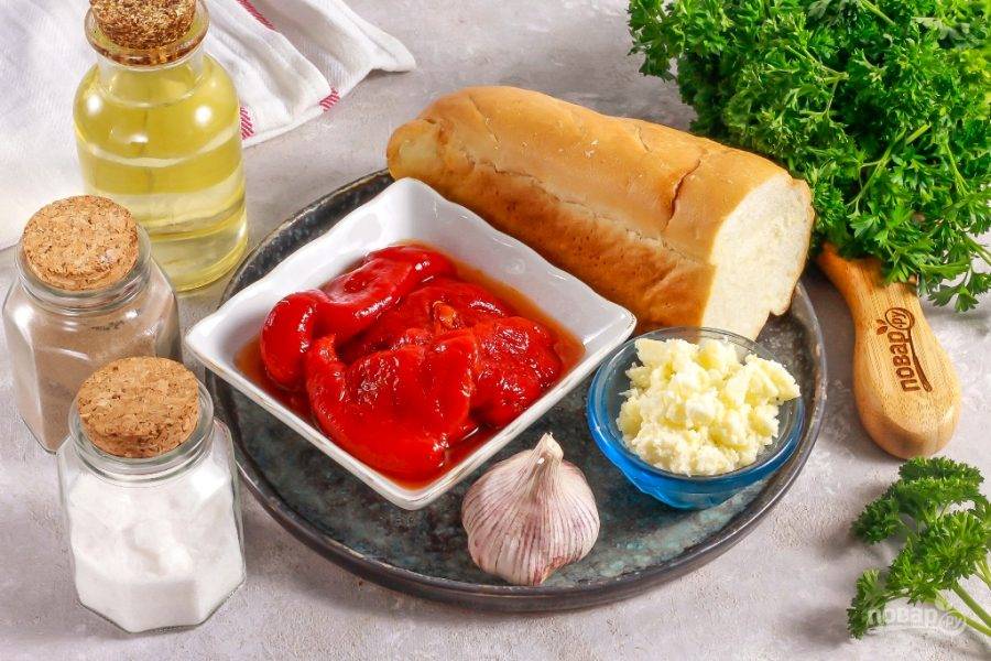 Подготовьте указанные ингредиенты. Болгарский перец лучше всего приобрести уже запеченный сорта "Паприка". Он более сочный и красочный, чем остальные сорта. Можно заранее запечь его в духовке примерно 30 минут, а затем очистить от кожуры и семян.