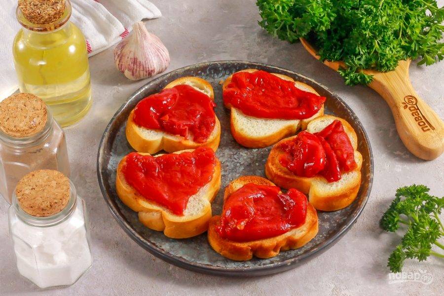 Выложите гренки на тарелку или блюдо и остудите минут 5. Затем выложите части печеного перца без кожуры и семян.