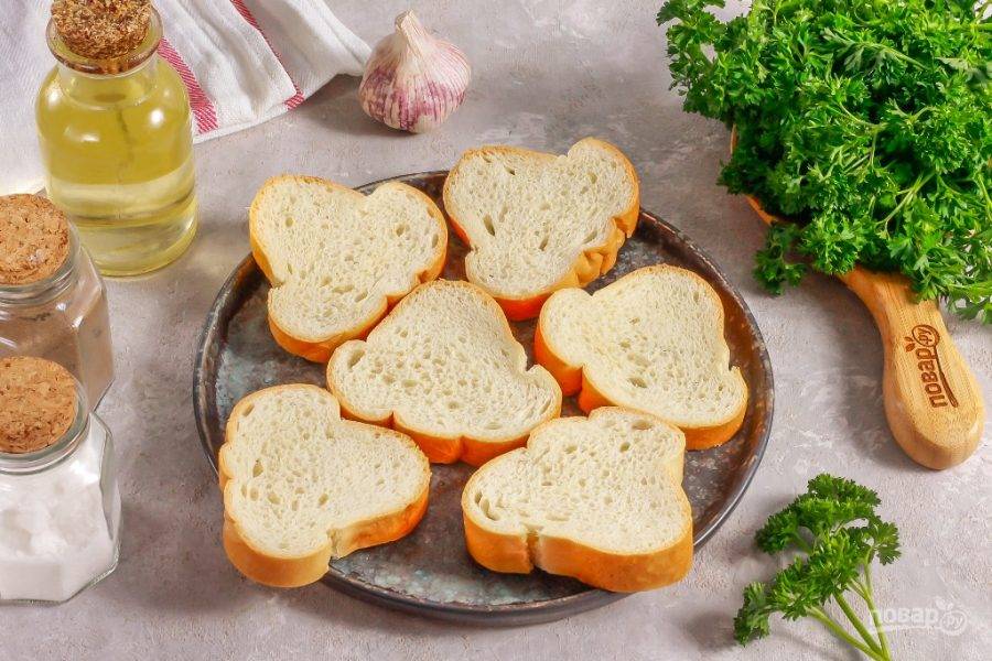 Багет нарежьте ломтиками шириной не более 1 см. Можно использовать белый, черный или ржаной хлеб.