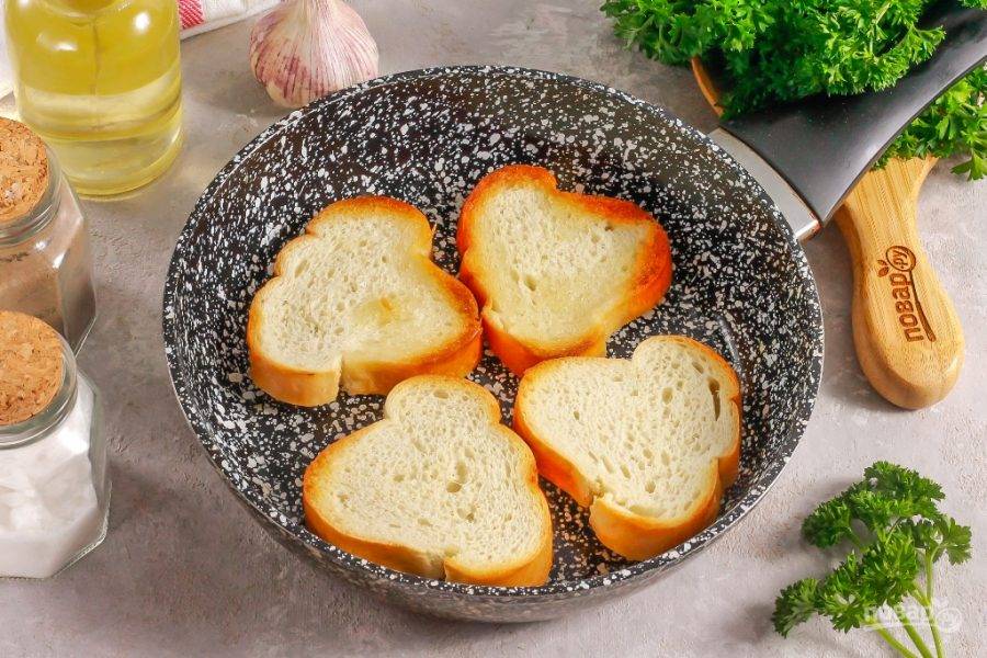 Очистите зубчики чеснока и нарежьте их слайсами. Прогрейте в сковороде растительное масло и обжарьте в нем чесночную нарезку 1 минуту. Затем извлеките чеснок и выложите в масло нарезку хлеба. Обжарьте по минуте с каждой стороны до румяности.
