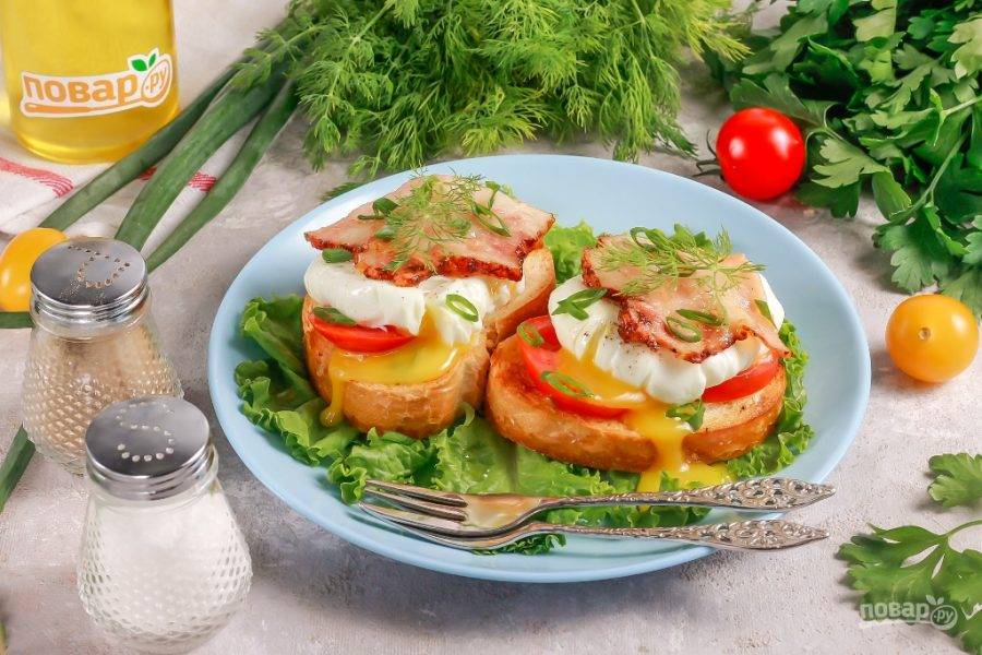 В течение минуты поджарьте ломтики бекона с обиех сторон на сковороде и выложите на яйца-пашот. Промойте и измельчите зеленый лук, присыпьте им приготовленные брускетты.