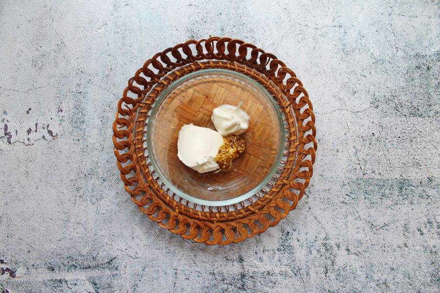 В миске смешайте сливочный сыр, сметану и зерновую горчицу.
