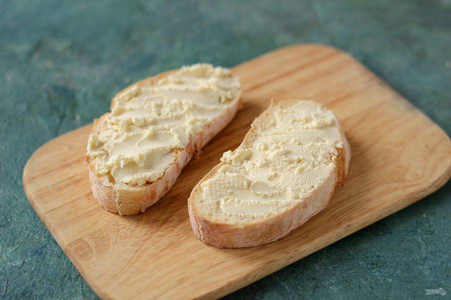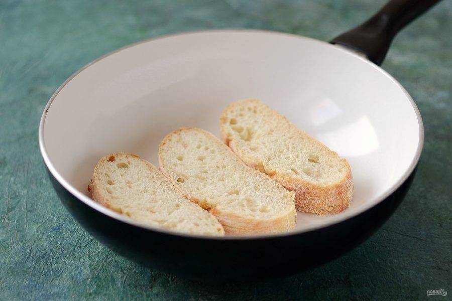 Хлеб нарежьте ломтиками средней толщины и обжарьте на сухой сковороде с двух сторон.