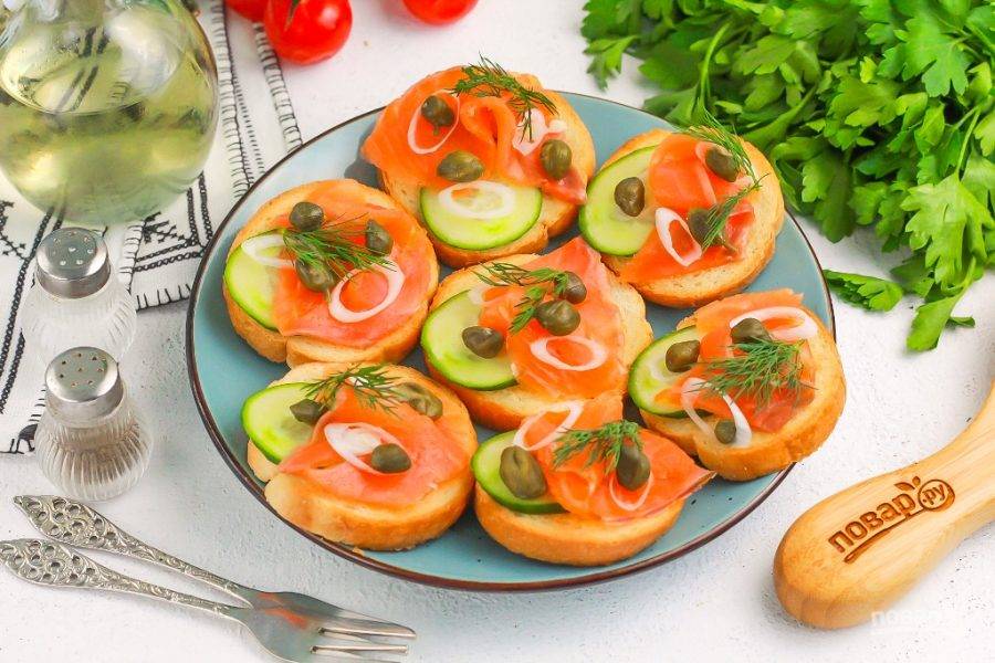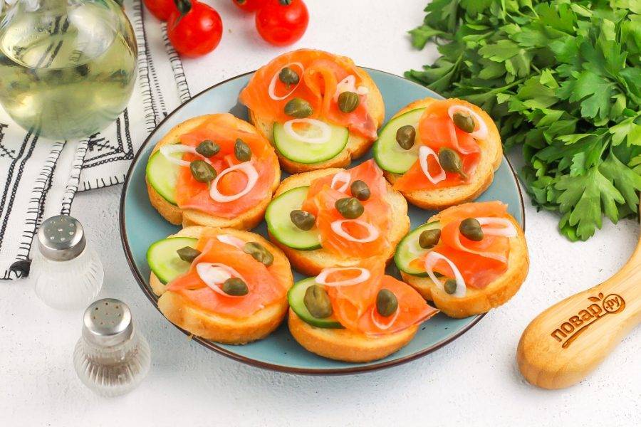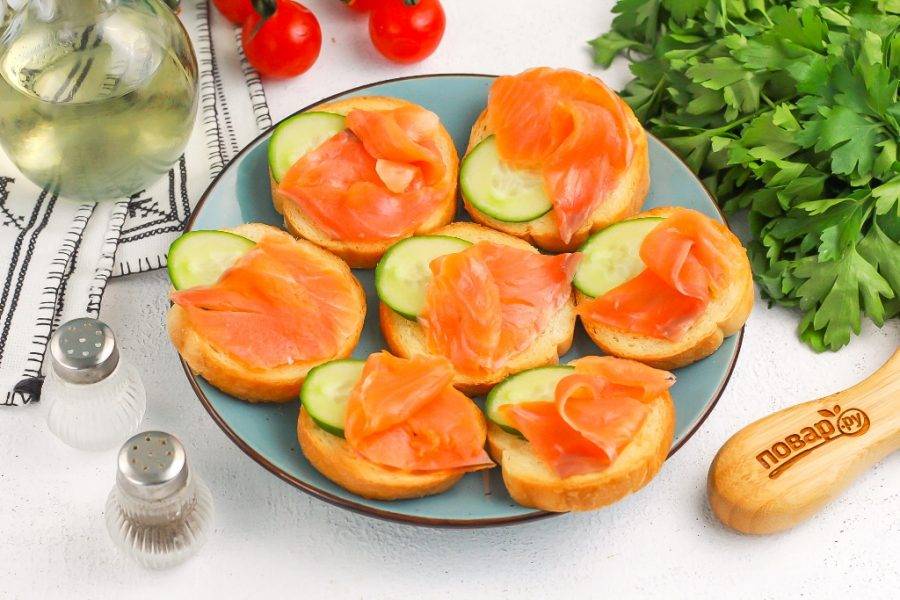 Нарезку семги выложите сверху, слегка подворачивая ее, чтобы брускетты смотрелись аппетитнее.