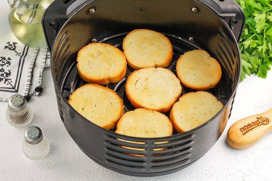 В чашу аэрогриля выложите ломтики багета и сбрызните их растительным маслом. Активируйте технику на 5-6 минут при температуре 160 градусов.