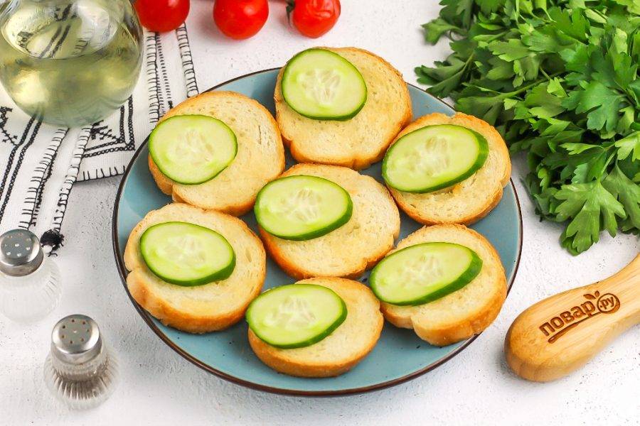 В это время промойте огурец и нарежьте его кружочками, промойте зеленый лук. Выложите ломтики огурца на поджаренные тосты.