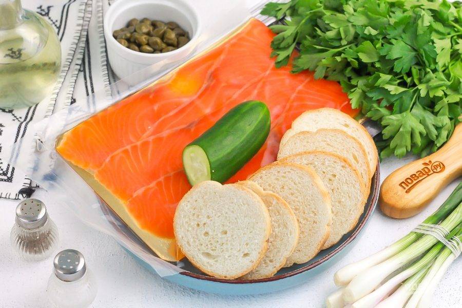 Подготовьте указанные продукты. Промойте свежую зелень, багет нарежьте ломтиками, если приобрели не нарезанным.