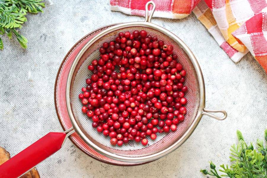 Ягоды переберите, удаляя листья, веточки и порченные или мятые ягоды. Бруснику вымойте в холодной воде, откиньте на сито и дайте воде полностью стечь.