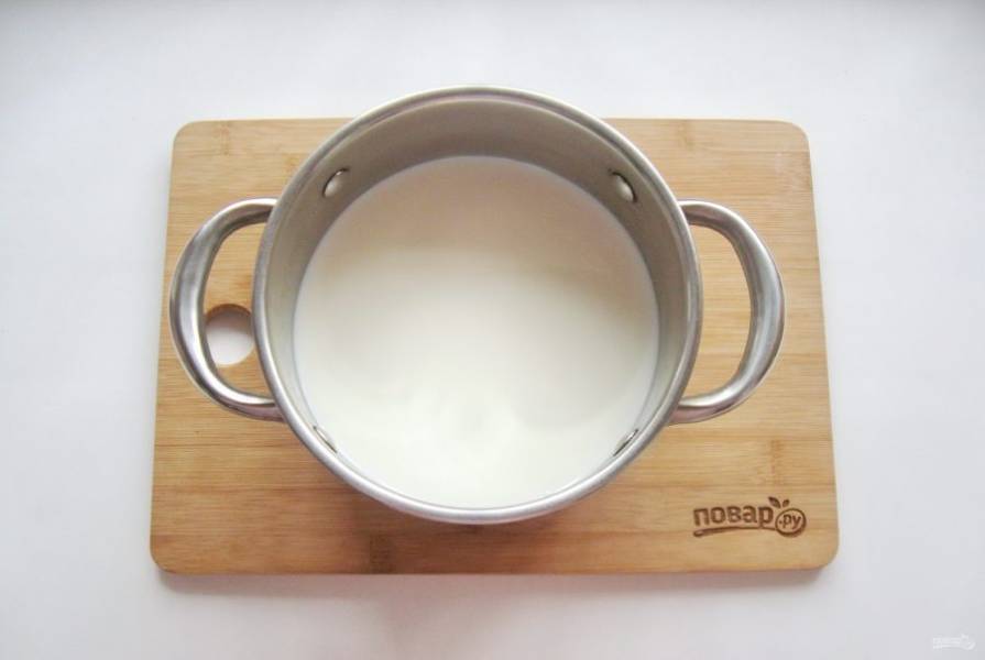 В кастрюлю с толстым дном налейте молоко и поставьте на огонь.