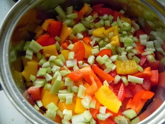 Моем сельдерей и перец. Очищаем перец от сердцевины. Нарезаем сельдерей и перец небольшими кусочками и выкладываем поверх помидор. Солим и перчим.