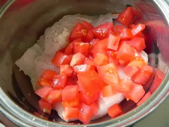 Рыбку моем, чистим и нарезаем на порционные куски. Солим, перчим и выкладываем на дно кастрюли или глубокой сковородки с крышкой. Помидоры чистим от кожи и нарезаем кубиками. распределяем помидоры поверх рыбы.