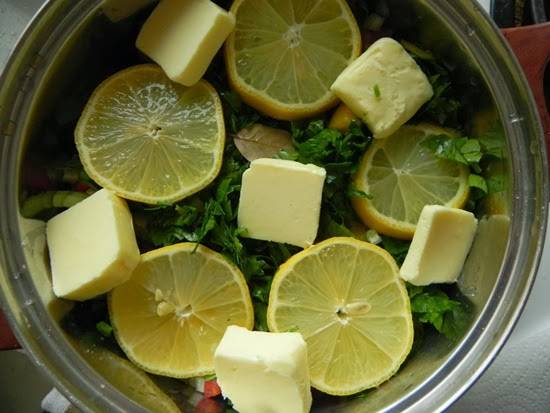 Поверх овощей выкладываем нарубленную зелень и кусочки лимона. Масло разрезаем на небольшие кубики и распределяем поверх лимонов. Плотно закрываем кастрюлю крышкой и ставим на средний огонь примерно на пол часа.