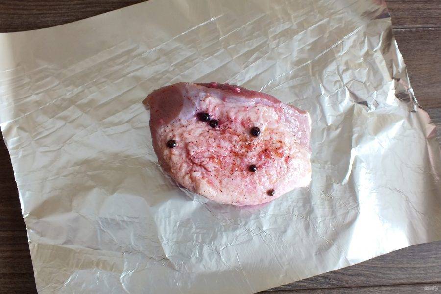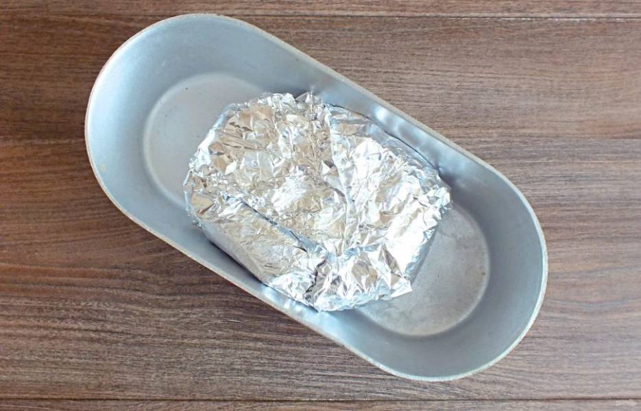 Возьмите фольгу. Выложите на нее подготовленную свинину. Заверните так, чтобы место соединения краёв фольги было наверху.