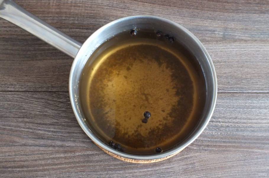 Приготовьте рассол. В сотейник налейте воду, добавьте адыгейскую соль, несколько штук можжевеловых ягод. Поставьте на огонь. После закипания проварите 2-3 минуты. Снимите с огня. Охладите.