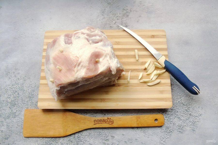Затем достаньте из рассола, обсушите салфеткой. Чеснок очистите, помойте и нарежьте полосками размером со спичку. С помощью острого ножа сделайте надрезы и нашпигуйте чесноком мясо.