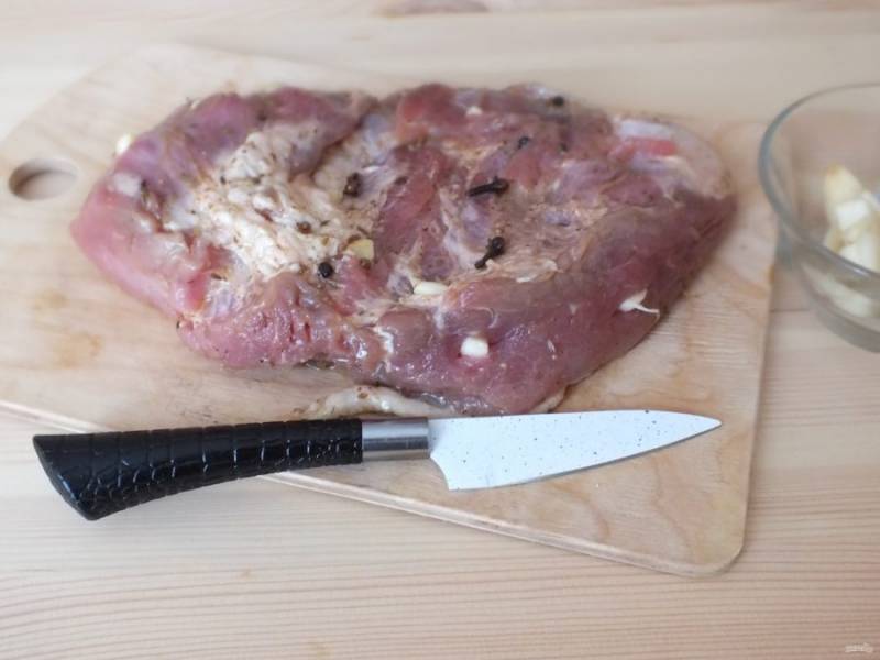 По истечении времени, в мясе сделайте ножом проколы и вложите кусочки чеснока.