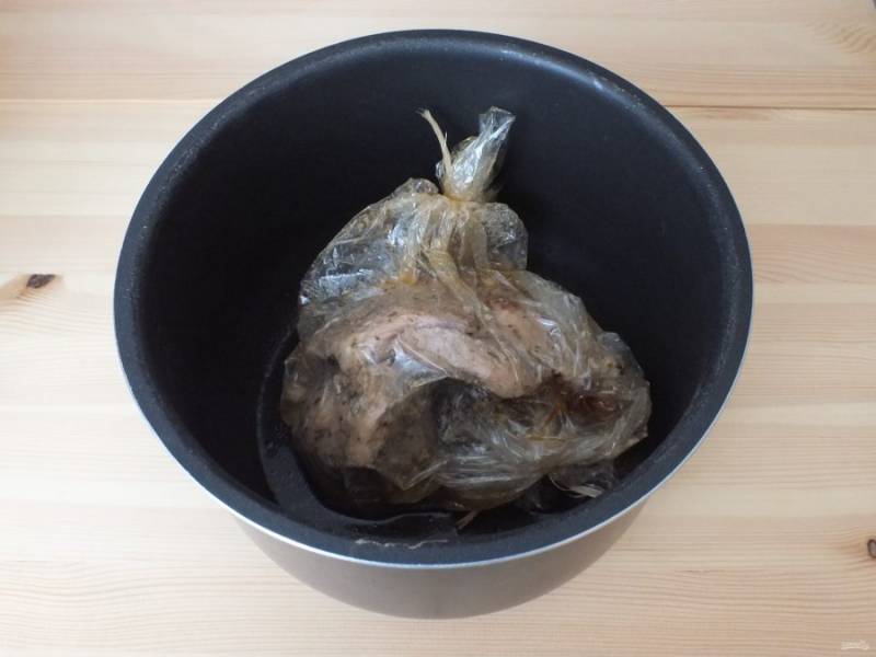 Чашу мультиварки вымойте, налейте 100 мл. воды и опустите рукав с мясом. Включите режим "Выпечка" на 40 минут. По истечении времени, переключите на режим "Томление" или "Тушение" на 2 часа.
