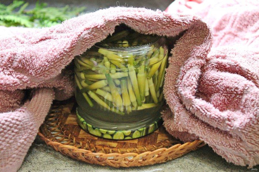 Из стерилизованных банок вылейте воду и заполните подготовленными бульбочками. Залейте банки кипятком, прикройте крышками и оставьте на 10 минут.
