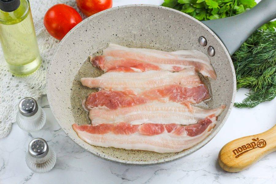 Бекон промойте и просушите салфетками. Разделите пополам. Сбрызните сковороду растительным маслом и выложите на нее половину полосок бекона, обжарьте до румяности с обеих сторон.
