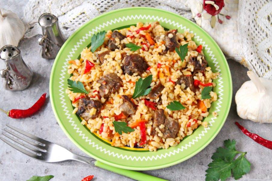 Вкусное и сытное блюдо для всей семьи на обед или ужин. Булгур с говядиной отлично разнообразит ваше меню и отлично заменит любимый плов. А с его приготовлением справится любая хозяйка. Берите идею!
