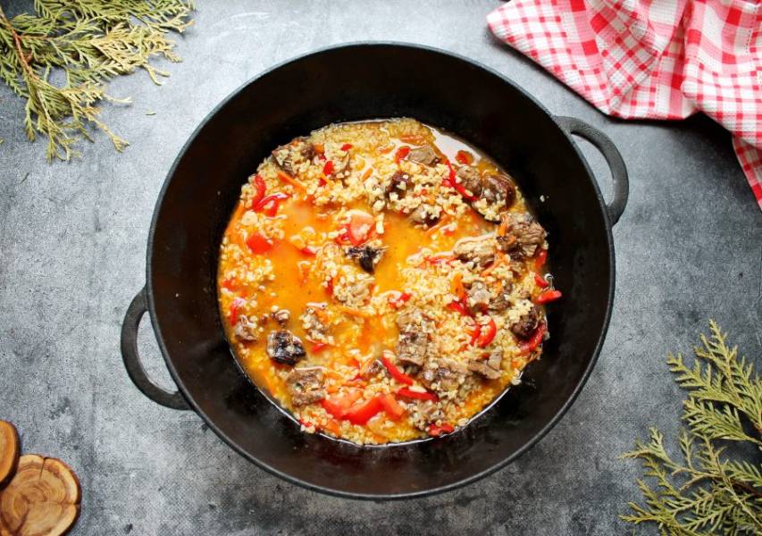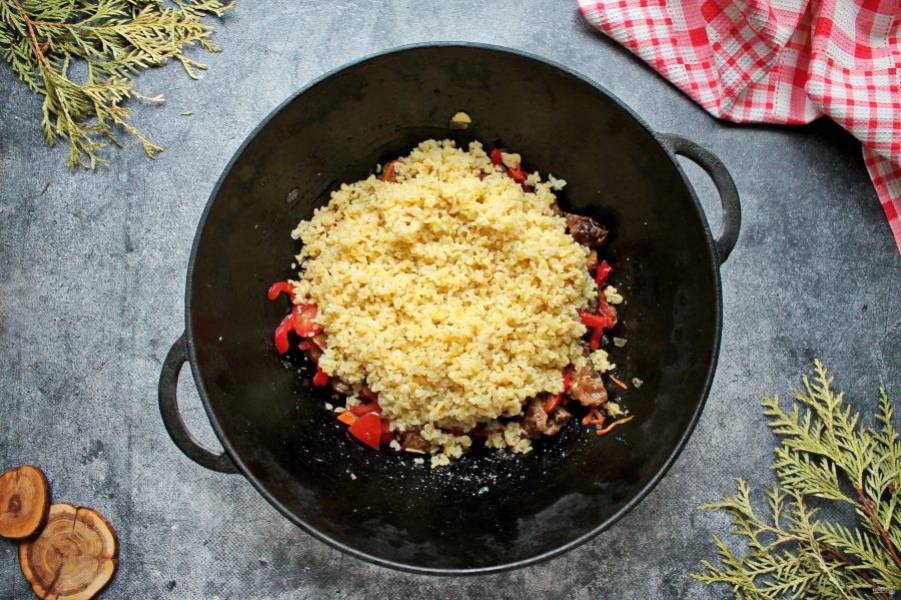 Булгур промойте в теплой воде и добавьте в казан с мясом и овощами.