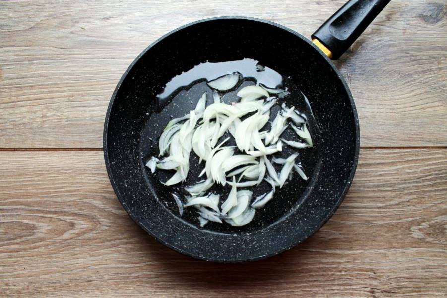 В сковороду налейте растительное масло и выложите репчатый лук, порезанный тонкими перьями.