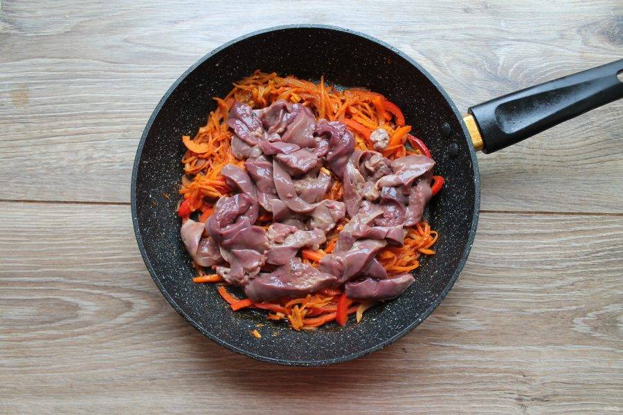 Куриную печень сполосните и порежьте пластинами. Перемешайте и обжаривайте все в течение 5-7 минут. Все посолите и поперчите.