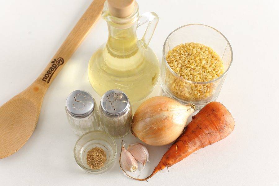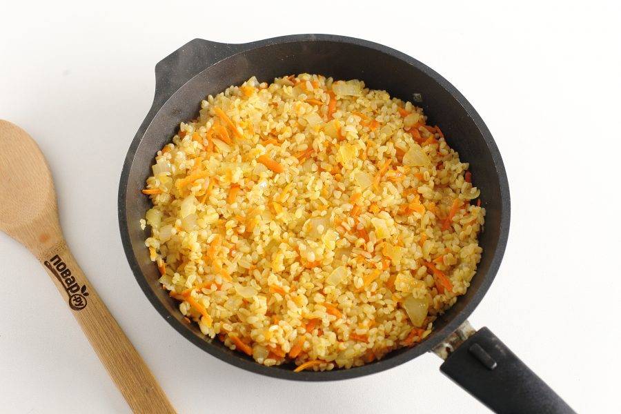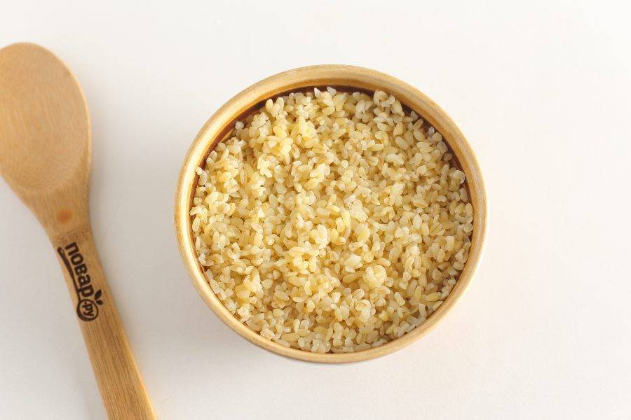 Булгур промойте и залейте кипятком, чтобы крупа вся была покрыта. Накройте крышкой и оставьте на 15-20 минут для набухания.
