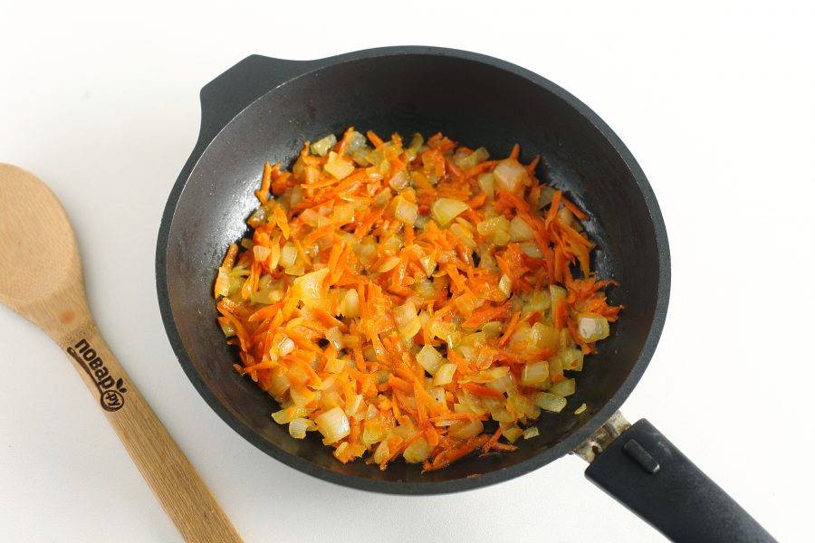 Лук нарежьте кубиками, а морковь натрите на терке. Выложите овощи на разогретую сковороду с маслом.