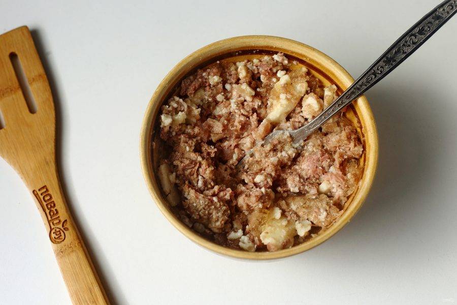 Тушенку разомните вилкой.