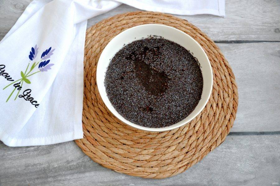 Пока тесто поднимается, займитесь приготовлением маковой начинки. Залейте мак кипятком, накройте крышкой, оставьте для набухания на 30-40 минут.