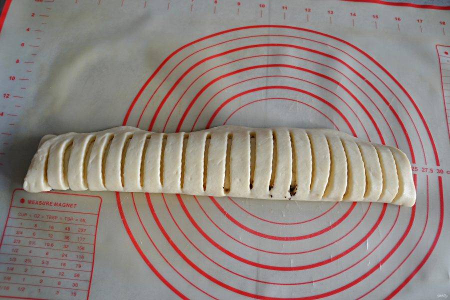 Выложите тесто в форму, сворачивая улиткой. Оставьте на расстойке примерно на 30 минут.
