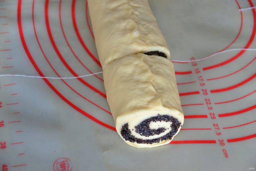Для приготовления булочек вторым способом смажьте маковой начинкой всю поверхность теста, не доходя до края примерно 3-5 см.