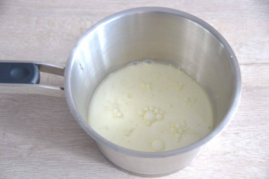 В сотейник влейте молоко и растительное масло, доведите до кипения.