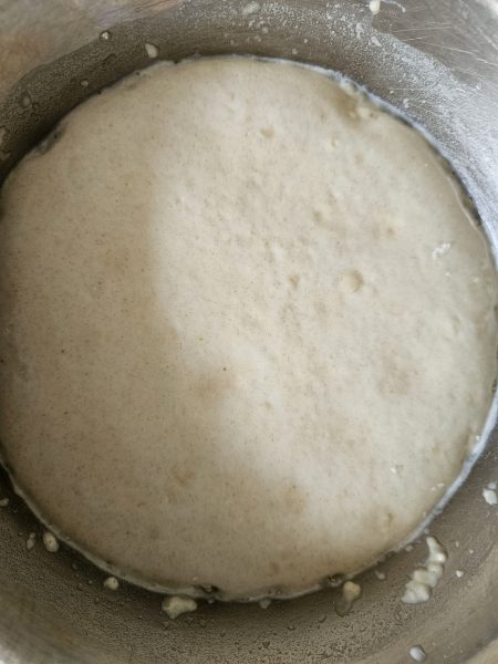 Добавьте к этой дрожжевой смеси 100 грамм муки и активно перемешайте все венчиком – это опара. Миску с опарой затяните пищевой пленкой и поставьте в теплое место на 30 минут.