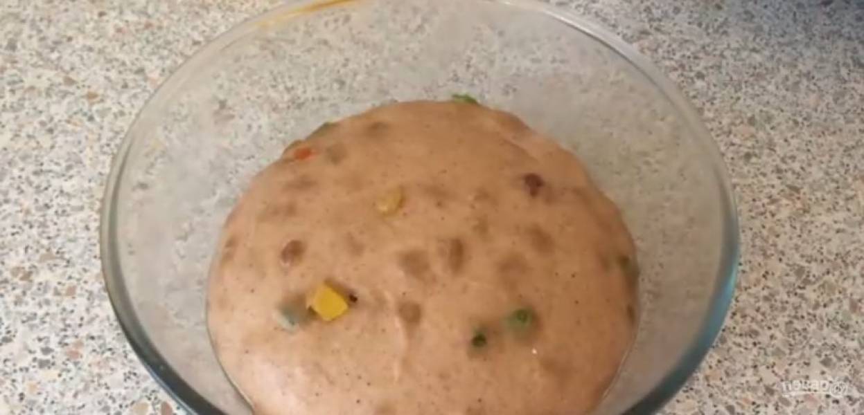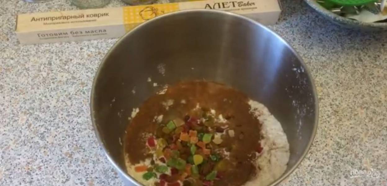 2. Просеянную муку перетрите с маслом до состояния крошки. Добавьте опару, теплое молоко, соль, корицу, сахар, яйца, смесь сухофруктов и цукатов. Вымесите тесто в течение 5 минут на 2 скорости в тестомесе.