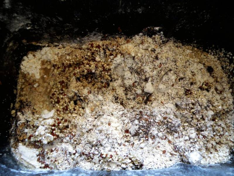 Киноа хорошо промыть, залить кипятком и дать остыть. Слить через сито и использовать в булочках. Заложить продукты в ведерко хлебопечки согласно инструкции к вашей модели. Я сначала закладываю жидкие: смесь воды и сыворотки, яйцо и растительное масло. Добавляю мед, соль, солод и размешиваю. Затем всыпаю просеянную смесь разной муки, добавляю подготовленное киноа и семена льна. Сверху кладу дрожжи.