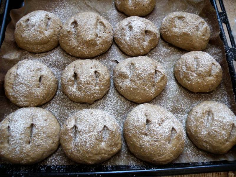 Смазываю булочки подслащенной водой и присыпаю сверху чуть мукой.