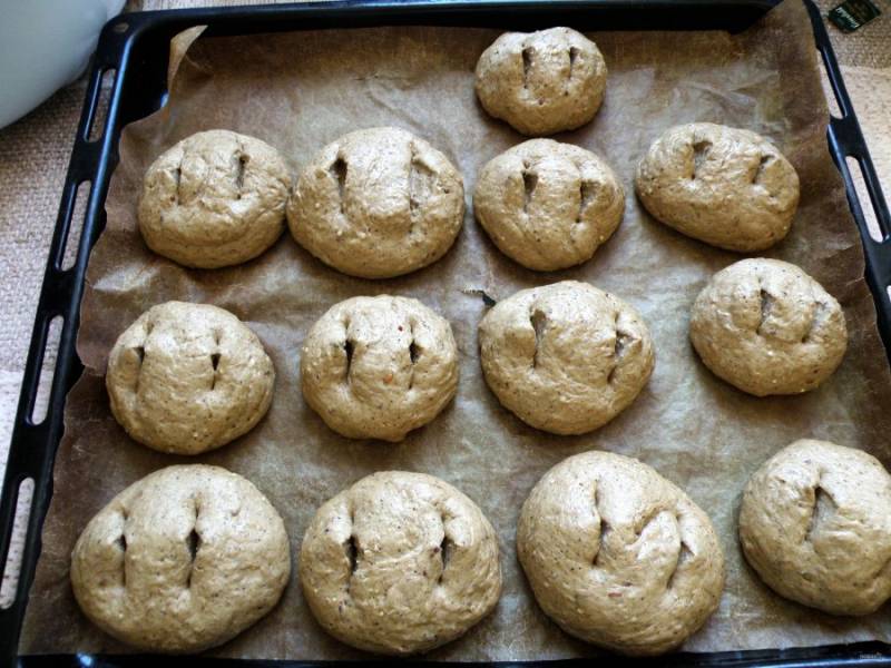 Разделываю тесто на кусочки размером со среднее яблоко. Подкатываю в шарики, кладу на лист, покрытый ковриком для выпечки и делаю пару насечек на каждой булочке. Прикрываю пищевой пленкой и даю расстояться вдвое.