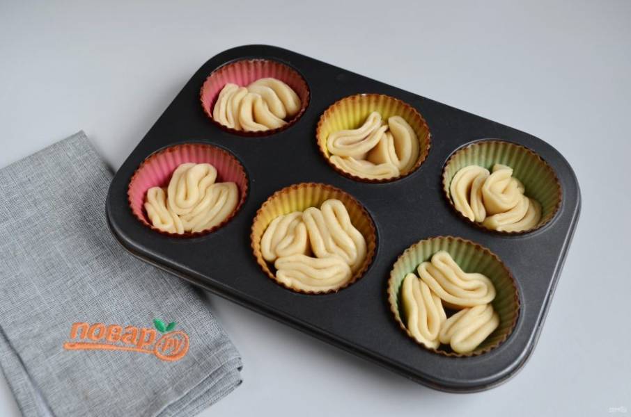 8. В силиконовые формочки вкладывайте по три четвертушки. У меня получилось 10 булочек. Поставьте в теплое место подходить минут на 20, потом смажьте яйцом. Выпекайте при 180 градусах минут 20-25.