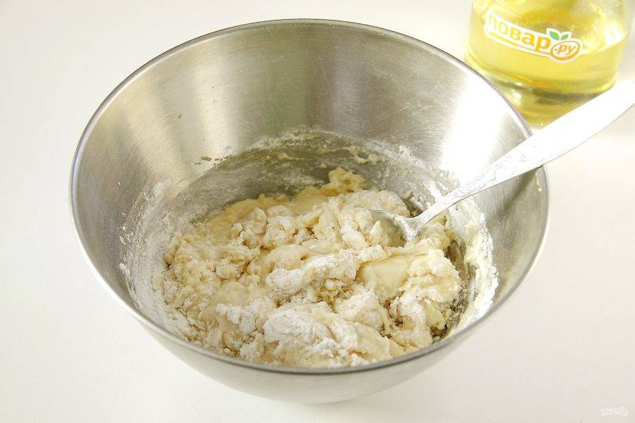 Когда тесто станет сложно перемешивать ложкой, продолжите вымешивать его руками.