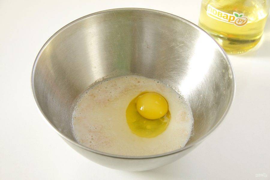 Как только опара будет готова, перелейте ее в глубокую миску. Добавьте яйцо.