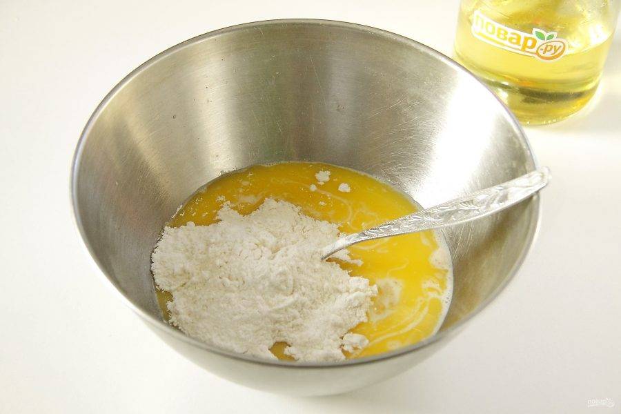 Перемешайте и частями введите муку, каждый раз перемешивая тесто ложкой.