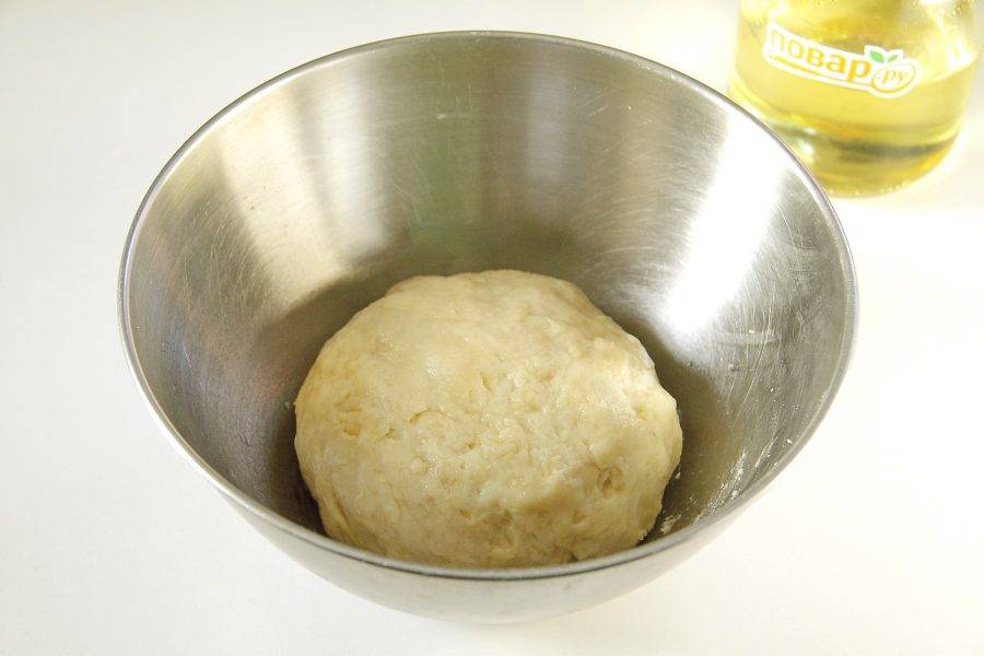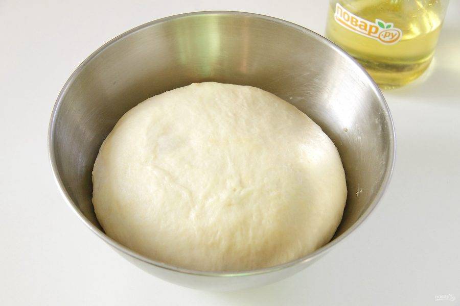 Муки может уйти чуть больше или меньше, чем указано в рецепте. Тесто должно получиться мягким и чуть липнуть к рукам. Соберите его в шар, смажьте растительным маслом, накройте миску чистым полотенцем и поставьте в теплое место на 1 час.