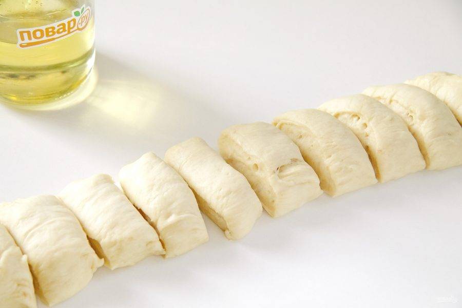 Сделайте из теста толстую колбаску и разрежьте ее на одинаковые кусочки. Размер кусочков зависит от желаемого размера готовых булочек.