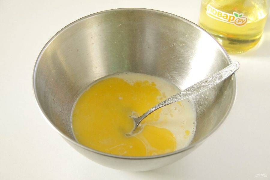 Перемешайте, чтобы яйцо разошлось и добавьте растопленное и охлажденное сливочное масло и соль.